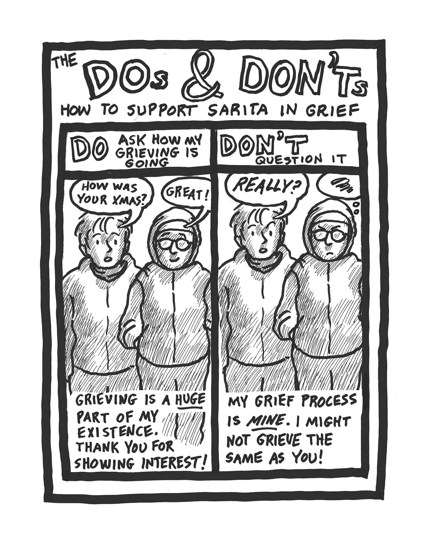 (Oh, by the way, no one EVER asks me directly “How’s your grieving going?” It’s always “How are you doing?” “How was your holiday?”)