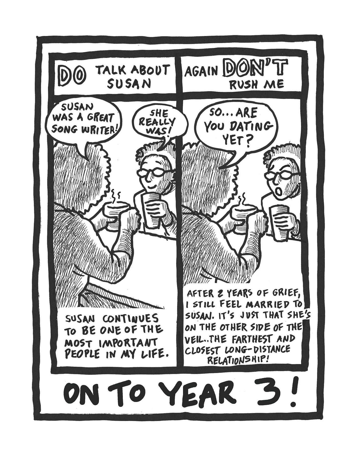 Yesterday marked Year Two since my wife, Susan, died from multiple myeloma. I’m quite pleased with my grieving process which includes: talking A LOT to Susan, repurposing her wardrobe, taking my sweet time clearing out her stuff I don’t want, crying when it hits, and reveling in my solitude.